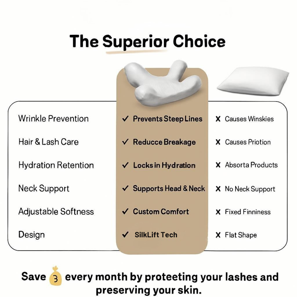 Your skincare routine works hard all night—but what if your pillow is undoing it all? Traditional pillows press, crease, and compress your skin for 8 hours every night, creating the fine lines and wrinkles you're desperately trying to avoid. Our anti-wrinkle pillow uses ergonomic SilkLift™ Technology to cradle your head while keeping your face gently elevated—eliminating compression, reducing friction, and letting your skin breathe. The cooling silk pillowcase regulates temperature to prevent inflammation and breakouts, while the contoured design supports perfect neck alignment. It's like giving your face a spa treatment while you sleep.